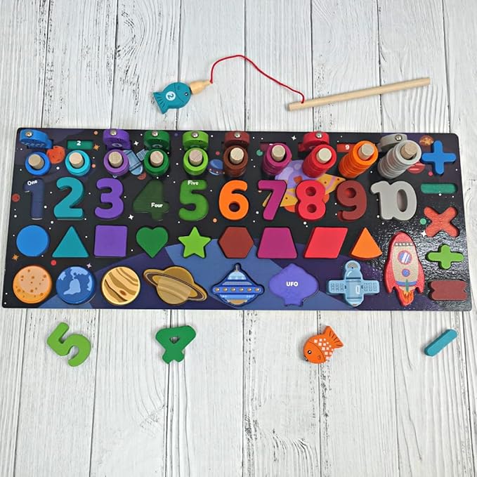 Using the included magnetic fishing rod, kids can “catch” numbers and pieces, improving hand-eye coordination and fine motor skills while building early math and problem-solving abilities. The vibrant space-themed design keeps children engaged and excited to learn.